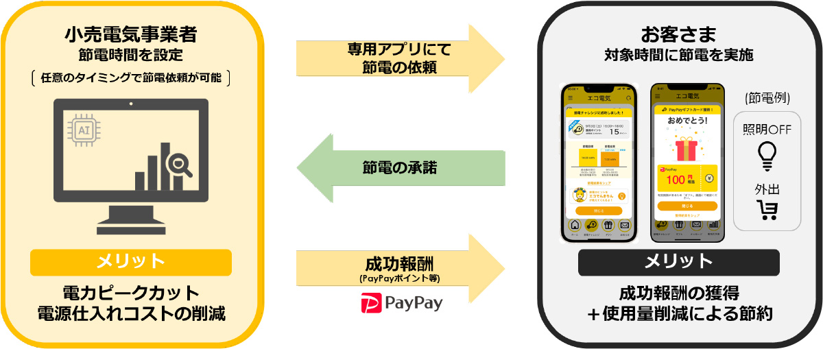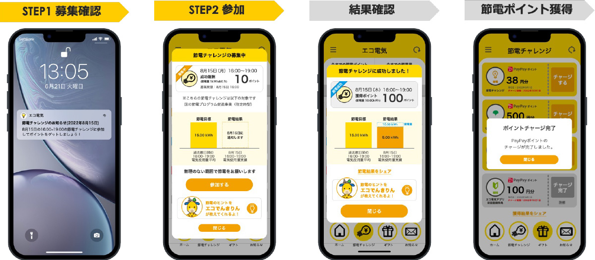 SBパワーは、エンコアードの特許技術を活用し、スマホアプリを通してお客さまに節電を呼びかける家庭向けの節電サービス「エコ電気アプリ」の提供を、2020年7月に日本で初めて開始しました。専用スマホアプリからは、節電状況やCO2の削減状況を確認できます。アプリ内の「節電チャレンジ」は、スマホのプッシュ通知で節電タイミングをリアルタイムにお知らせし、お客さまがアプリ内の「参加する」をタップして節電に参加すると、翌日に取り組み結果を確認できるシンプルな仕組みです。ゲーム感覚で節電に挑戦していただき、節電に成功するとPayPayポイント※6が付与されるため、電気料金の削減とともにおトクに節電に取り組んでいただけます。